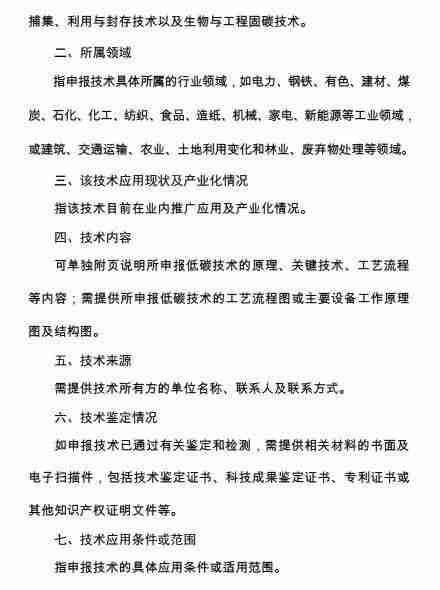 电力、钢铁、有色、建材、煤炭、石化、化工、纺织、食品、造纸、机械、家电、新能源等工业领域,以及建筑、交通运输、农业、土地利用变化和林业、废弃物处理等领域的低碳技术,可以是单一技术、产品、装备、工艺流程或系统性工程技术等。